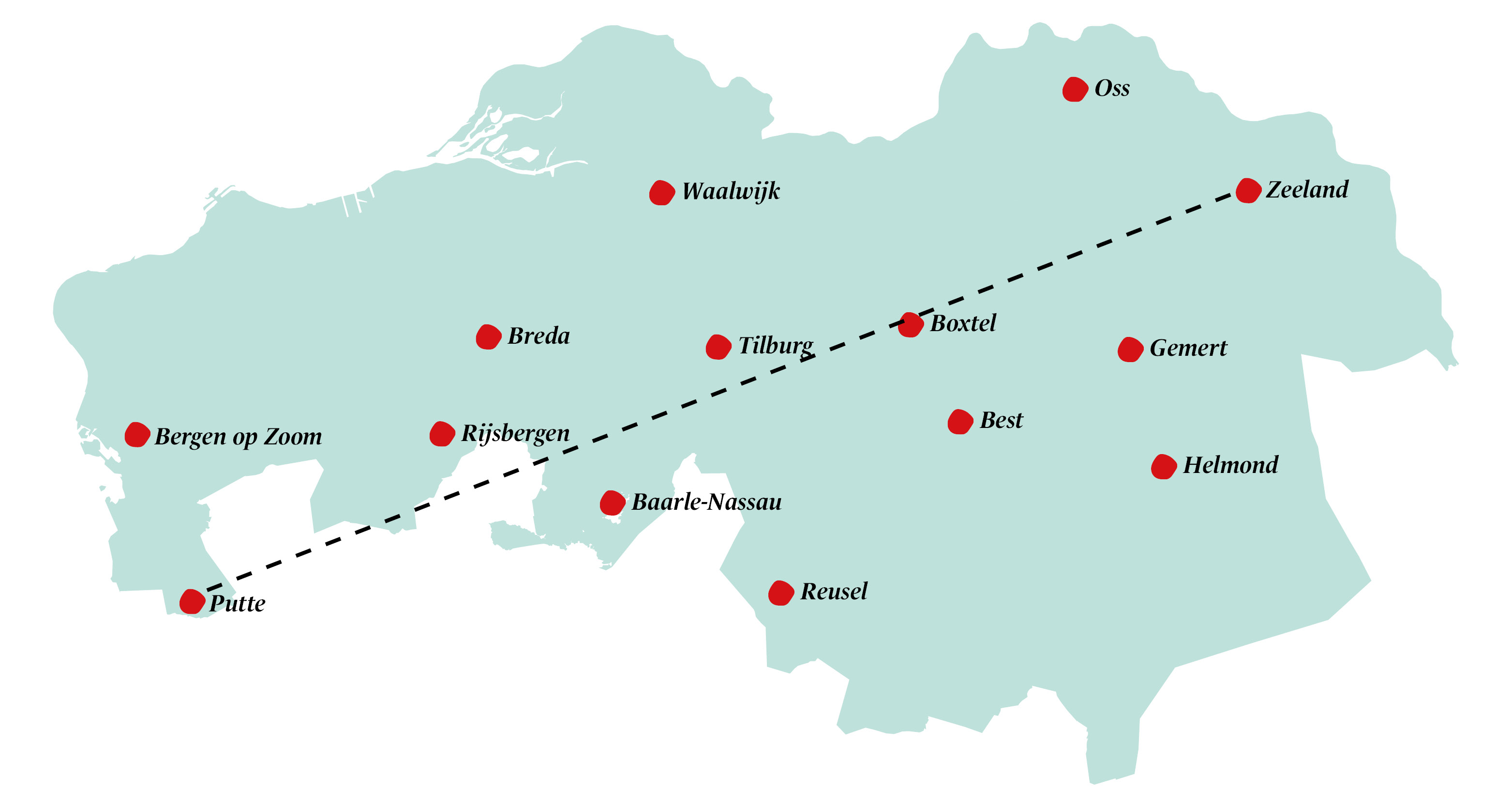 Van Putte tot Zeeland en alles daartussen en omheen. De plaatsen aangegeven op deze kaart geven slechts een idee van de uiteenlopende regio's en betreffen niet alle locaties die mee worden genomen in de Werkplezier Tour.